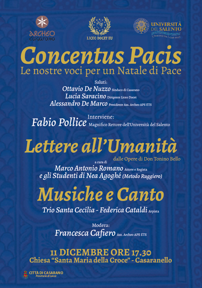 Lunedì 11 dicembre 2023 a partire dalle ore 17:30 la Chiesa di Santa Maria della Croce ospiterà la rassegna Natalizia “Concentus Pacis – Le nostre voci per una Natale di Pace“organizzata dal Liceo Docet in collaborazione con l’Associazione Archeo APS ETS.
