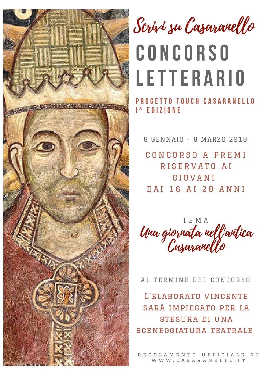Le Associazioni Culturali ArcheoCasarano “Origini e futuro” e Domus Dei nell’ambito del Progetto “Touch Casaranello”, indicono la prima edizione del Concorso Letterario “Scrivi su Casaranello”, finalizzato a dare spazio alla creatività e al talento dei ragazzi iscritti alle Scuole Superiori della Provincia di Lecce con un’età compresa tra 16 e 20 anni.