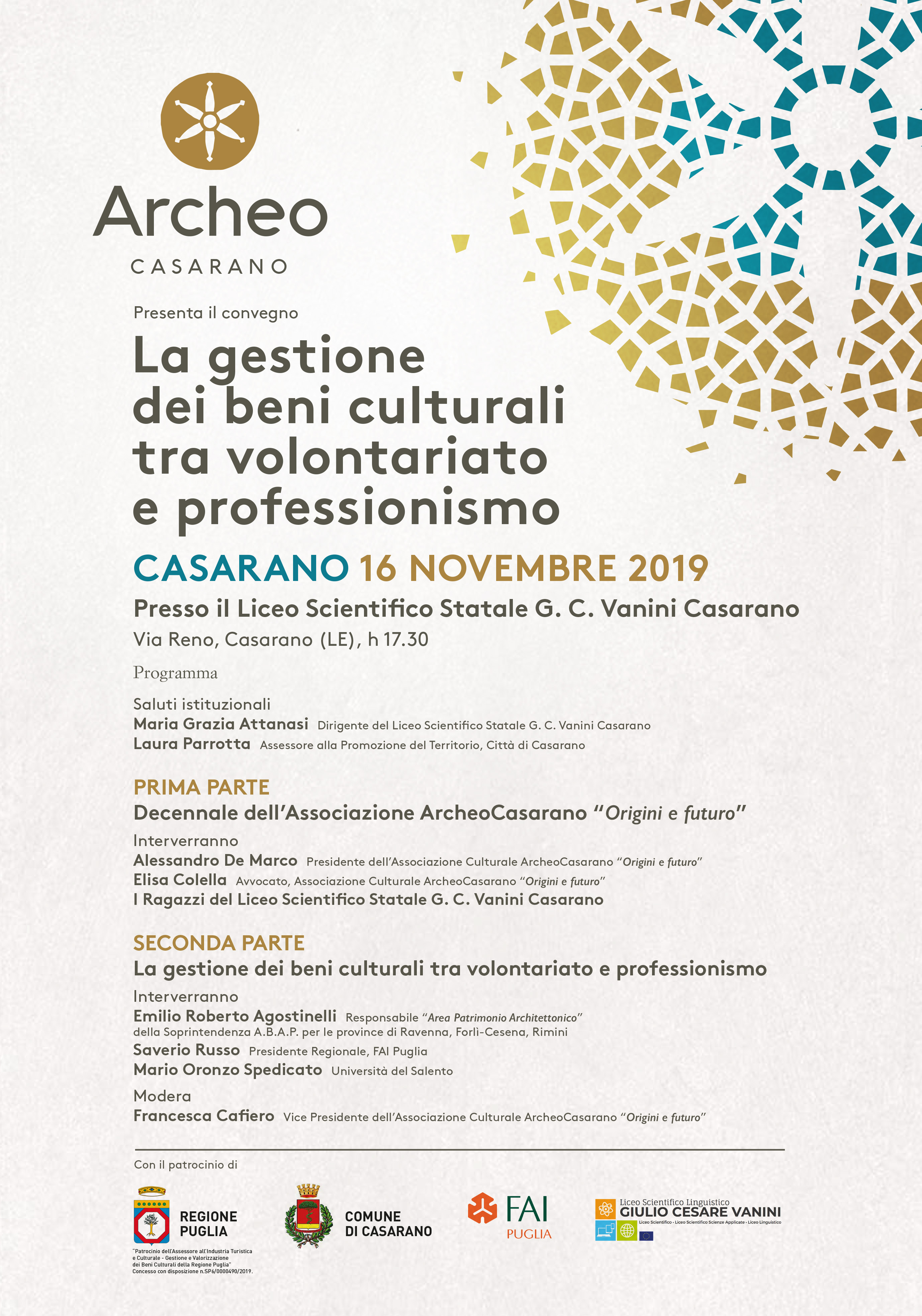 Il convegno ha ricevuto il patrocinio di: Regione Puglia, Comune di Casarano, FAI Puglia, Liceo Scientifico G.C. Vanini.