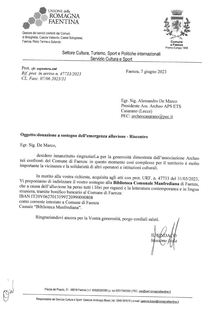 IMPORTANTE – In occasione delle Giornate dell’Archeologia, l’Associazione Archeo APS ha indetto una raccolta fondi destinati al recupero del patrimonio culturale della città di Faenza. La donazione a sostegno dell’emergenza alluvione è stata accolta ufficialmente dal Sindaco di Faenza, Massimo Isola e verrà destinata al ricovero del patrimonio della Biblioteca comunale Manfrediana.