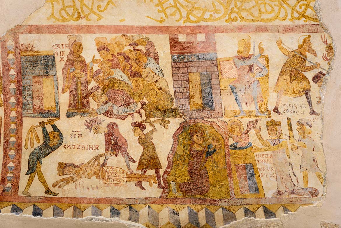 In seguito ai recenti restauri, è ben chiaro come al ciclo cristologico bizantino si sia sovrapposto il celebre ciclo tardo svevo, che narra per immagini il martirio delle Sante Caterina e Margherita, particolarmente venerate in quest’epoca. Segnate da una vivace vena espressiva, propria di questi cicli narrativi, esse rientrano appieno, all’esame stilistico, nella temperie artistica tardo-sveva, come precisato da Leone de Castris (1986), che le ha datate intorno agli anni 1250-1260. Probabilmente nello stesso tempo in cui il frescante svevo dipingeva le storie di queste sante, un secondo artista si occupava della nuova decorazione dell’abside, sovrapponendo alle figure dei due santi bizantini poste a sinistra, un ulteriore strato, il terzo, cioè il grande pannello, ora staccato e posto sulla parete perimetrale della navata destra, in cui è raffigurata una Deisis, nella quale si colgono alcune varianti (Falla Castelfranchi 2004).