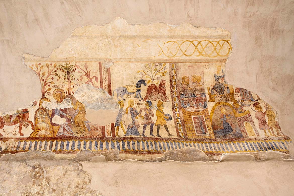Al pieno XII secolo, si situa un’ulteriore campagna decorativa che interessò le pareti della navata centrale, ove sono campite alcune immagini cristologiche. Colpisce il fatto che il susseguirsi delle scene superstiti, ovvero quattro scene appartenenti al ciclo della Passione, non rispetti la sequenza da destra verso sinistra, poiché le prime scene sono ubicate sulla parete sinistra della navata centrale, in senso antiorario, proseguendo sulla parete destra, e cioè La Crocefissione e Il Bacio di Giuda a sinistra, e poi probabilmente Le Pie donne al sepolcro, prima scena, poco leggibile, a destra cui segue una monumentale e scenografica Anastasis, di cui si intravedono a destra Salomone e Davide sotto una specie di tenda e, a sinistra, i progenitori (Falla Castelfranchi 1991). Gli spazi vuoti e le dimensioni delle scene superstiti fanno ipotizzare che il ciclo fosse articolato in dodici scene, il classico ciclo del dodekaorton.