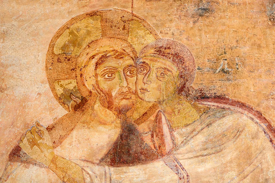 Allo stesso ciclo dovrebbe appartenere il dittico absidale sulla sinistra, di recente identificato. Sono santi ambedue accompagnati da iscrizioni votive in greco fatte realizzare dai committenti Giorgio e Demetrio: il santo a sinistra è un vescovo e dovrebbe essere identificato quale san Nicola. Per il santo martire accanto al vescovo dell’abside, i confronti, secondo Falla Castelfranchi (2004) vanno estesi a comprendere la bella figura, acefala, del santo martire raffigurato sulla parete destra della chiesa di S. Pietro a Giuliano di Lecce. Potrebbe trattarsi di san Demetrio, constatate le lettere superstiti dell’iscrizione esegetica. Sotto questo strato pittorico, è forse visibile un ciclo più antico, probabilmente da ascrivere al secolo precedente.