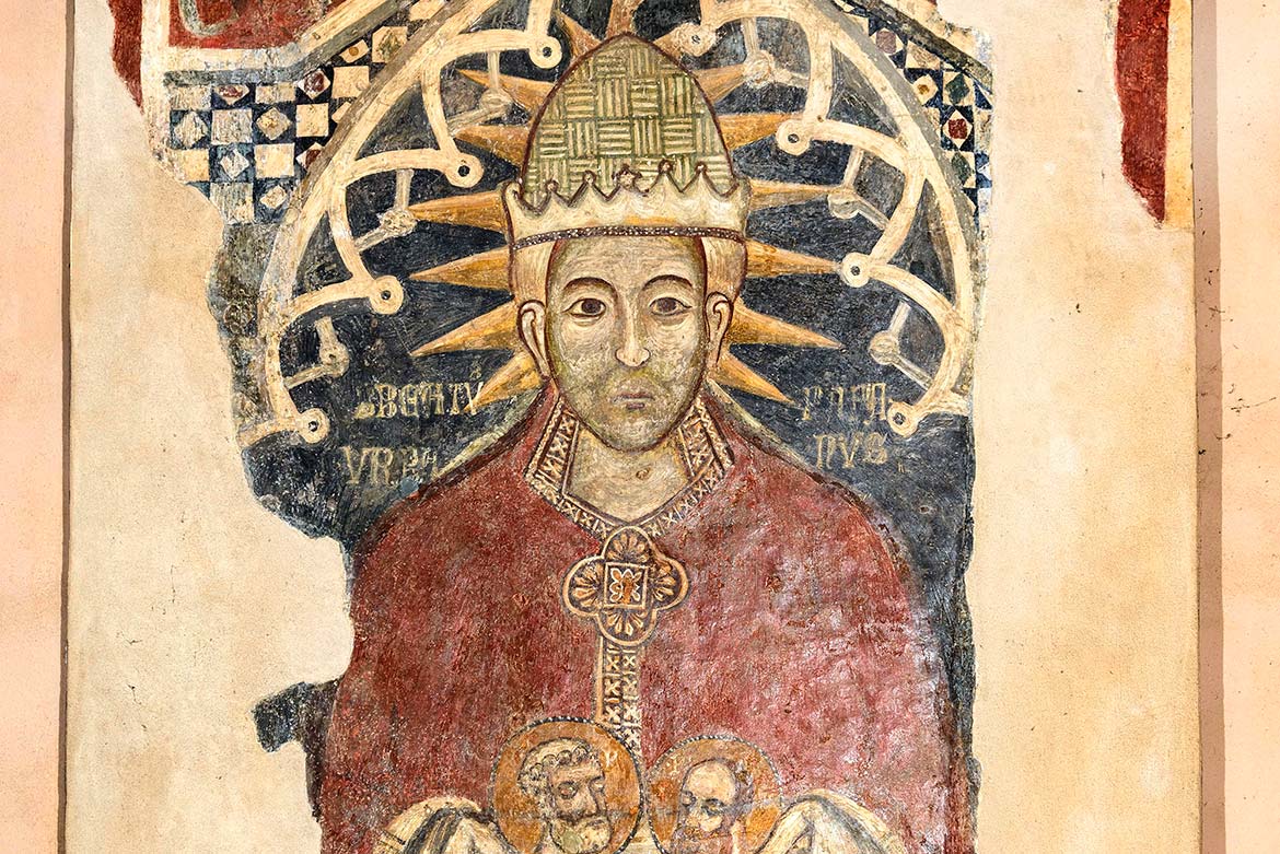 L’affresco di Urbano V copriva un tempo quello di Santa Barbara ed è oggi pensile sulla navata destra. Il pontefice è assiso in torno, come mostra il piviale che, rialzato dai polsi, ricade ai lati e poi risale bruscamente per sovrapporsi alle ginocchia. Del trono non si vede che il baldacchino cuspidato, aperto da un arco decisamente acuto, a lobi intrecciati, di carattere tardo-gotico. Fra l’estradosso dell’arco e i pioventi della cuspide il pittore volle imitare un tessellato di tipo vagamente cosmatesco (Prandi 1961). L’identità del santo viene corroborata dalla presenza delle teste dei Santi Pietro e Paolo, su un vassoio.