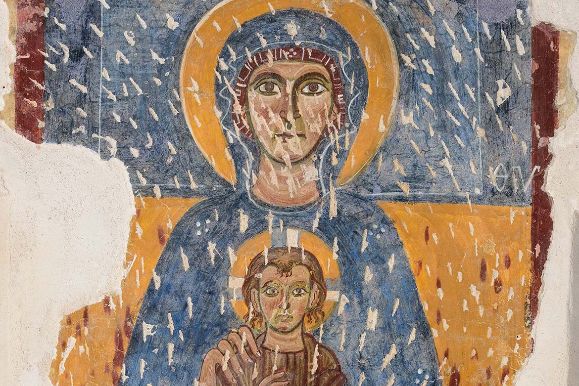 Proprio alcune iscrizioni sono incise sull’affresco eseguito sull’ultimo pilastro di sinistra della navata centrale, dove è campita una Vergine con Bambino. Jacob (1988) chiosa che in quell’epoca probabilmente già la chiesa era intitolata alla Vergine, in quanto un’iscrizione sulla destra ci riferisce della consacrazione della chiesa della Theotokos, alla presenza di un vescovo di Gallipoli. L’affresco è intriso di ieraticità e rappresenta una delle massime espressioni della pittura bizantina, con i caratteri di aspazialità ed atemporalità, con la benedizione del Bambino alla greca. I due Protagonisti sono allineati: la Vergine ostenta il Figlio come se fosse una teca e non avesse peso.
