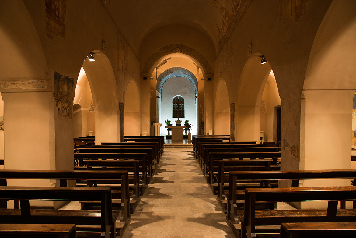 Falla Castelfranchi (2004; 2005) ipotizza già un’origine del sacro edificio a pianta basilicale divisa da pilastri, mentre Prandi ipotizzava una pianta a croce greca libera con l’ampliamento della navata centrale nel XIII secolo e l’aggiunta delle navate nel XIV secolo; quest’ultima ipotesi è stata smentita dai lavori di restauro degli anni ’70. Bucci Morichi (1988), dopo i lavori di restauro condotti, ha confermato le dimensioni attuali del sacro edificio sin dalle sue origini, grazie anche all’analisi della tessitura delle murature in elevato, ma ipotizzando un impianto originario a navata unica con navate laterali aggiunte in epoca altomedievale. Come ci riferisce anche Trinci Cecchelli (1974), la scoperta di un lacerto musivo pavimentale nella navata centrale, che sembra si debba riferire alla costruzione originaria, non rende più accettabile l’ipotesi di un edificio con pianta a croce greca. Si tratta di un motivo a tre file concentriche di cerchi (una scura, una rossa e un’altra scura) affiancati gli uni agli altri e anzi di poco intersecantesi, i quali dovrebbero contenere anche motivi decorativi oggi non più decifrabili.