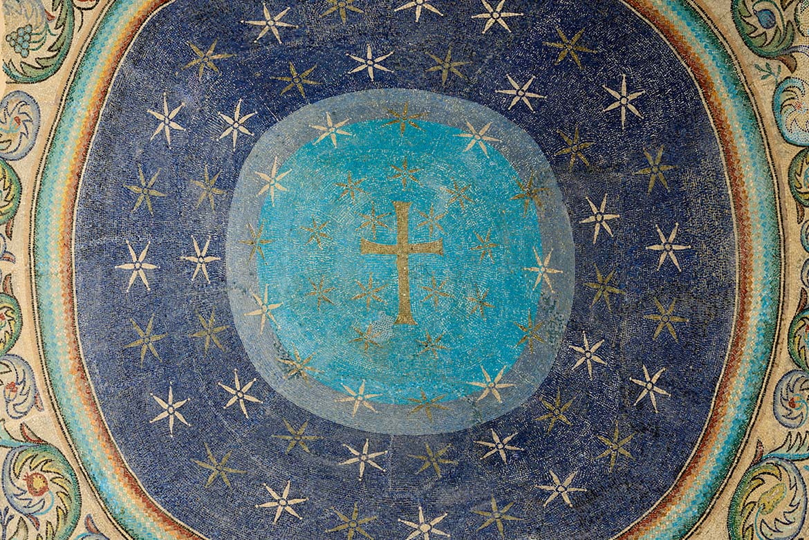 La cupola è dominata da una volta stellata al centro della quale galleggia una croce di tessere d’oro, con racemi che si inalveolano sinuosi su un fondo bianco nei pennacchi, è pervaso da una luce azzurrina, la tonalità predominante. Non c’è dubbio che la decorazione della cupola risponda piuttosto ad istanze di natura squisitamente simbolica e teologica. Il fondo su cui è campita la croce d’oro, punteggiato di stelle, trascolora infatti attraverso tre diverse gamme di azzurro, dall’azzurro cupo all’azzurro più cilestrino, trasparente, e diviene simbolo trinitario con degli esempi nel battistero di Albenga e nel mosaico con la Trasfigurazione del Sinai (550 circa). Più in basso, un ornato composto da una stretta fascia sottolineata da una notevole varietà di tinte, separano il cielo dai motivi vegetali su fondo bianco, composti da girali animati da melograni, pere rosacee e grappoli d’uva. In tre dei quattro pennacchi compaiono una foglia d’edera, nel quarto, un motivo forse zoomorfo, secondo Pisanò (2003) una medusa. Più in basso, una cornice decorativa che si innesta da festoni e che riprende quella della volta a botte.